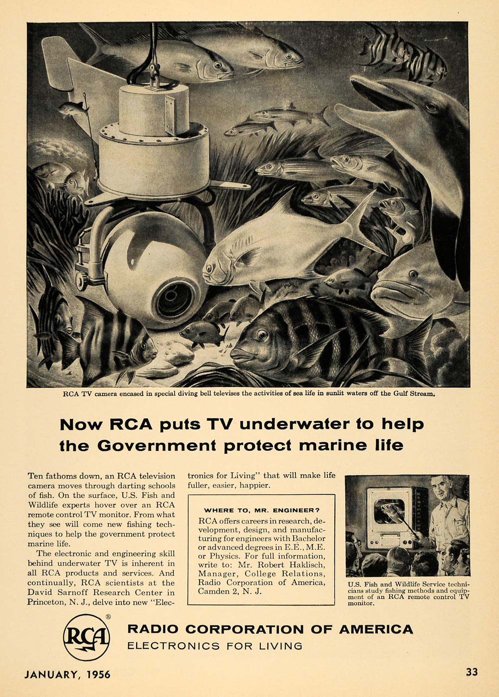 This is an original 1956 black and white print ad for the Radio Corporation of America. The ad writes, "Now RCA puts TV underwater to help the government protect marine life."