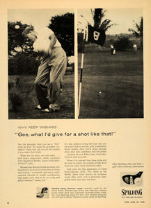 This is an original 1956 black and white print ad for Spalding Synchro-Dyned golf clubs. This particular ad features golfer Bobby Jones.