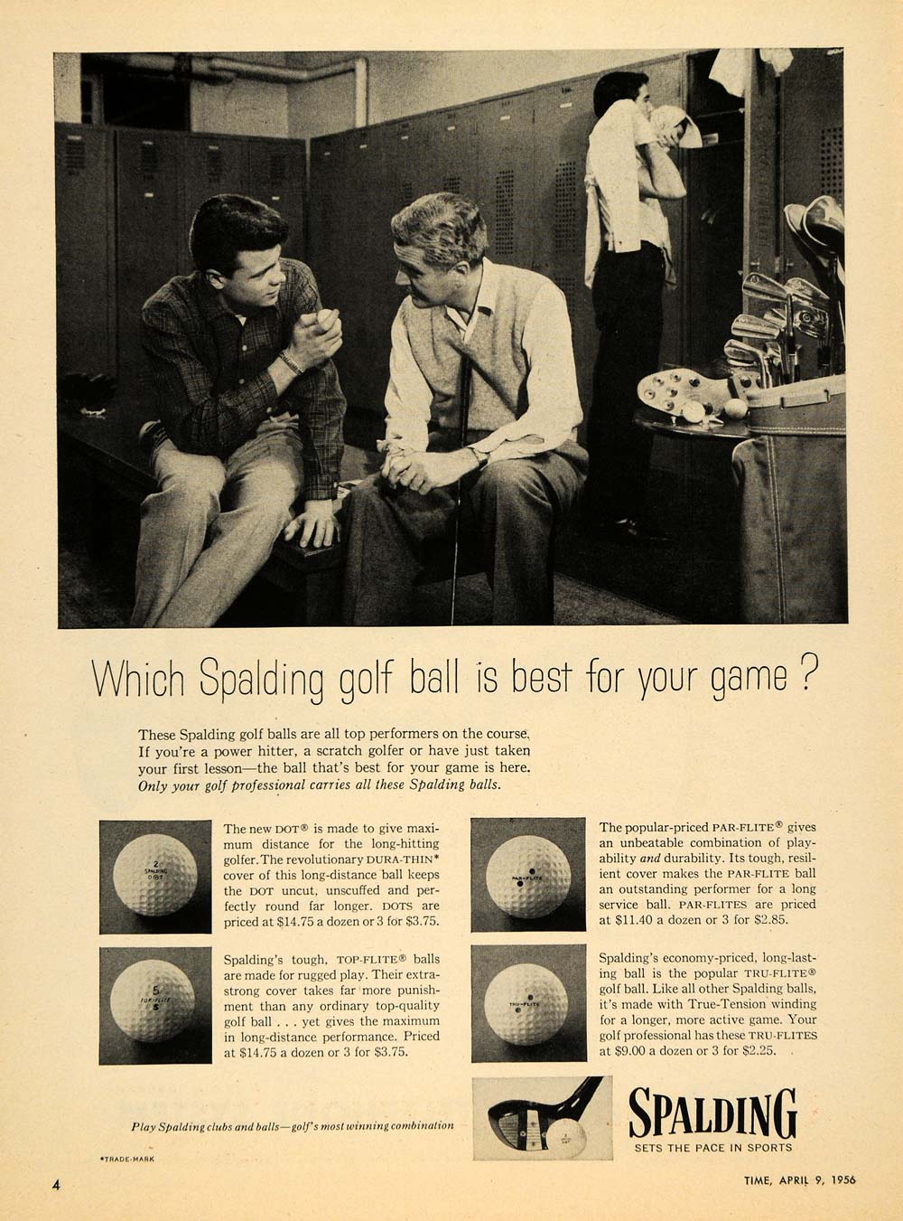 This is an original 1956 black and white print ad for Spalding Golf Balls, specially featuring the Dot, Top-Flite, Par-Flite and Tru-Flite models.