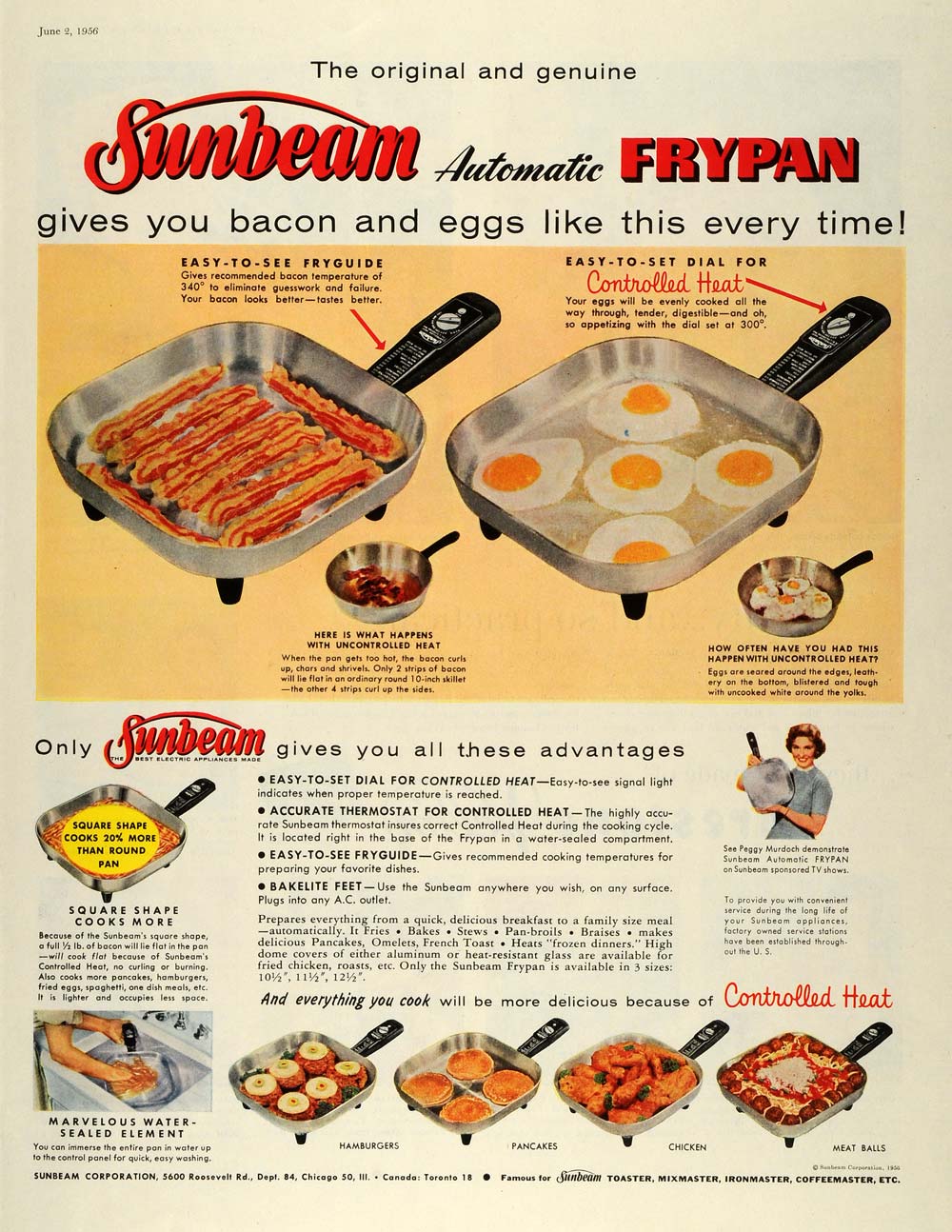 This is an original 1956 color print ad for the Sunbeam Automatic Frypan with a thermostat to control heat. Sunbeam Corporation is located at 5600 Roosevelt Road, Chicago, Illinois.