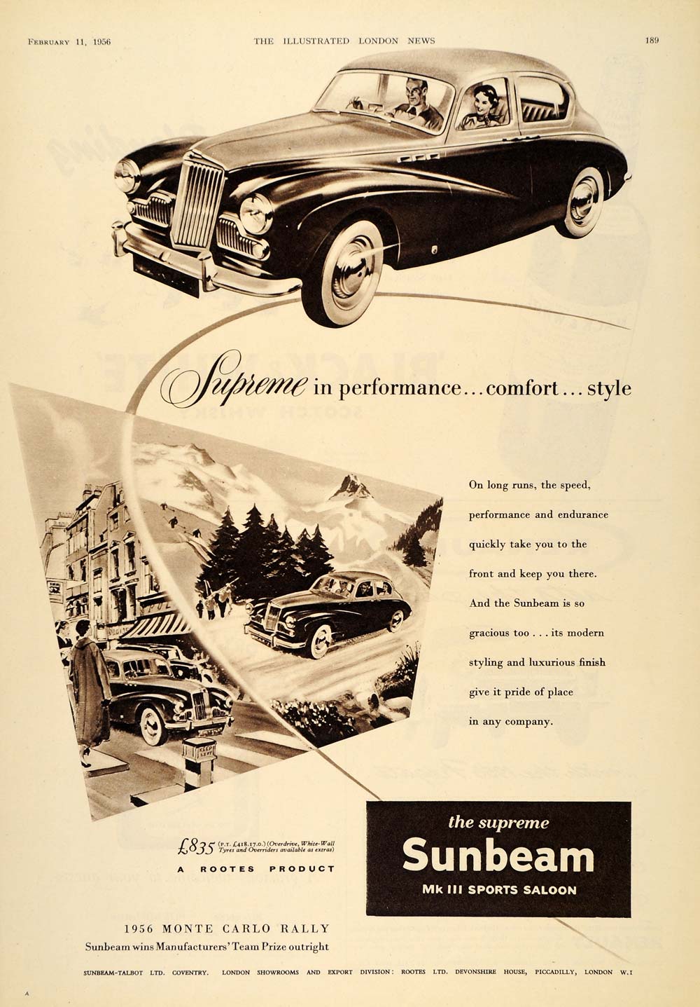 This is an original 1956 print ad for the Sunbeam Mk III Sports Saloon, winner of the Manufacturers' Team Prize at the 1956 Monte Carlo Rally, made by Sunbeam-Talbot Limited, a part of the Rootes Group.