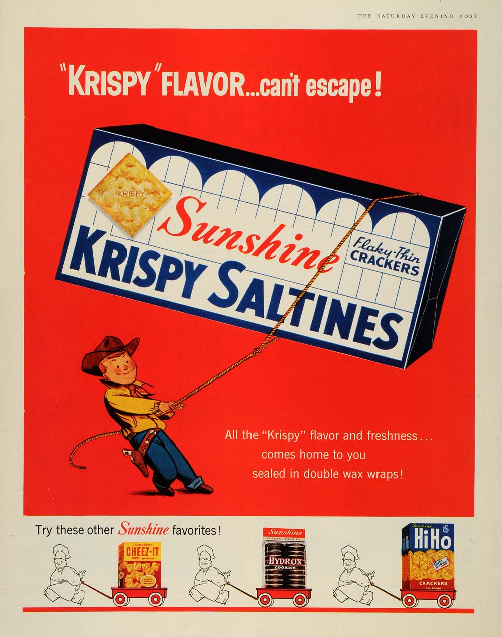 This is an original 1956 color print ad for Sunshine Krispy Crackers, as well as Hi Ho Crackers, Cheez-It Crackers and Hydrox Cookies.