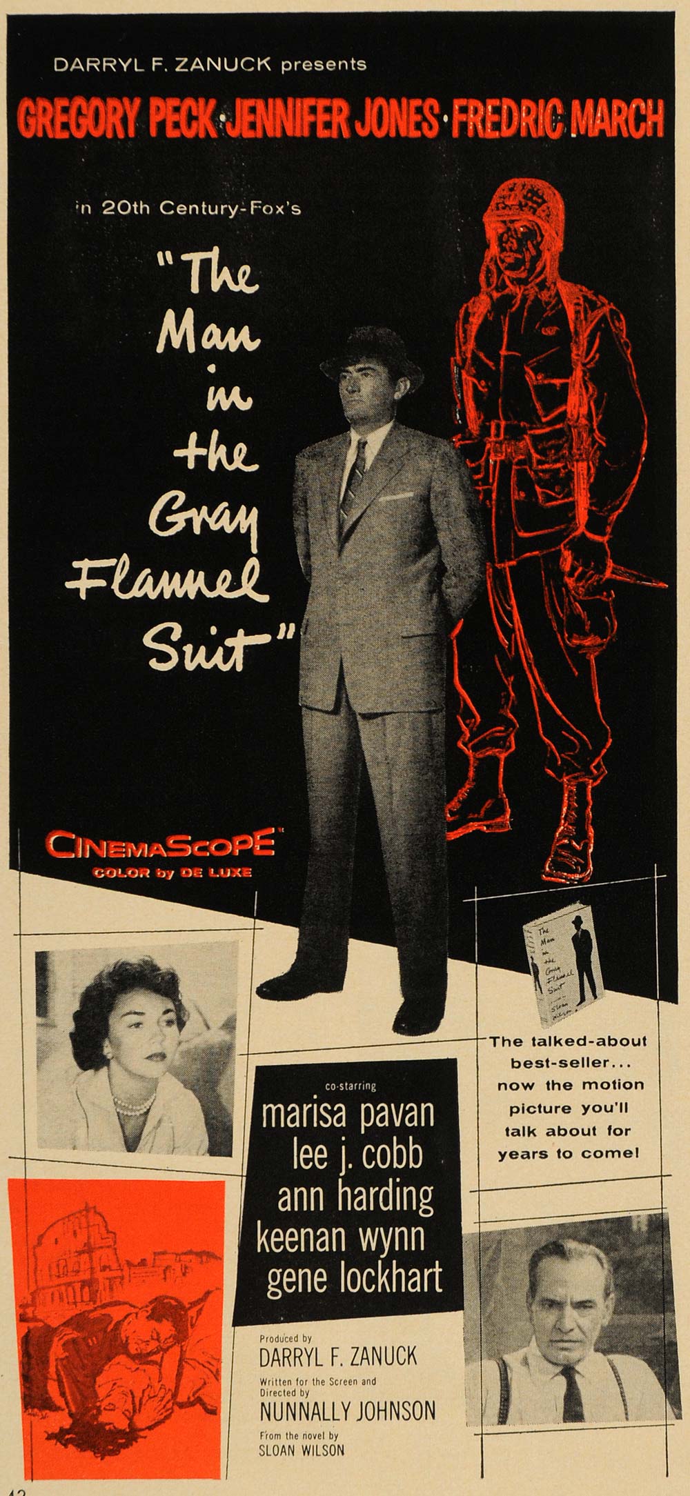 This is an original 1956 color print ad promoting the movie, "The Man in the Gray Flannel Suit", starring Gregory Peck, Jennifer Jones, Fredric March, Marisa Pavan, Lee J. Cobb, Ann Harding, Keenan Wynn and Gene Lockhart.
