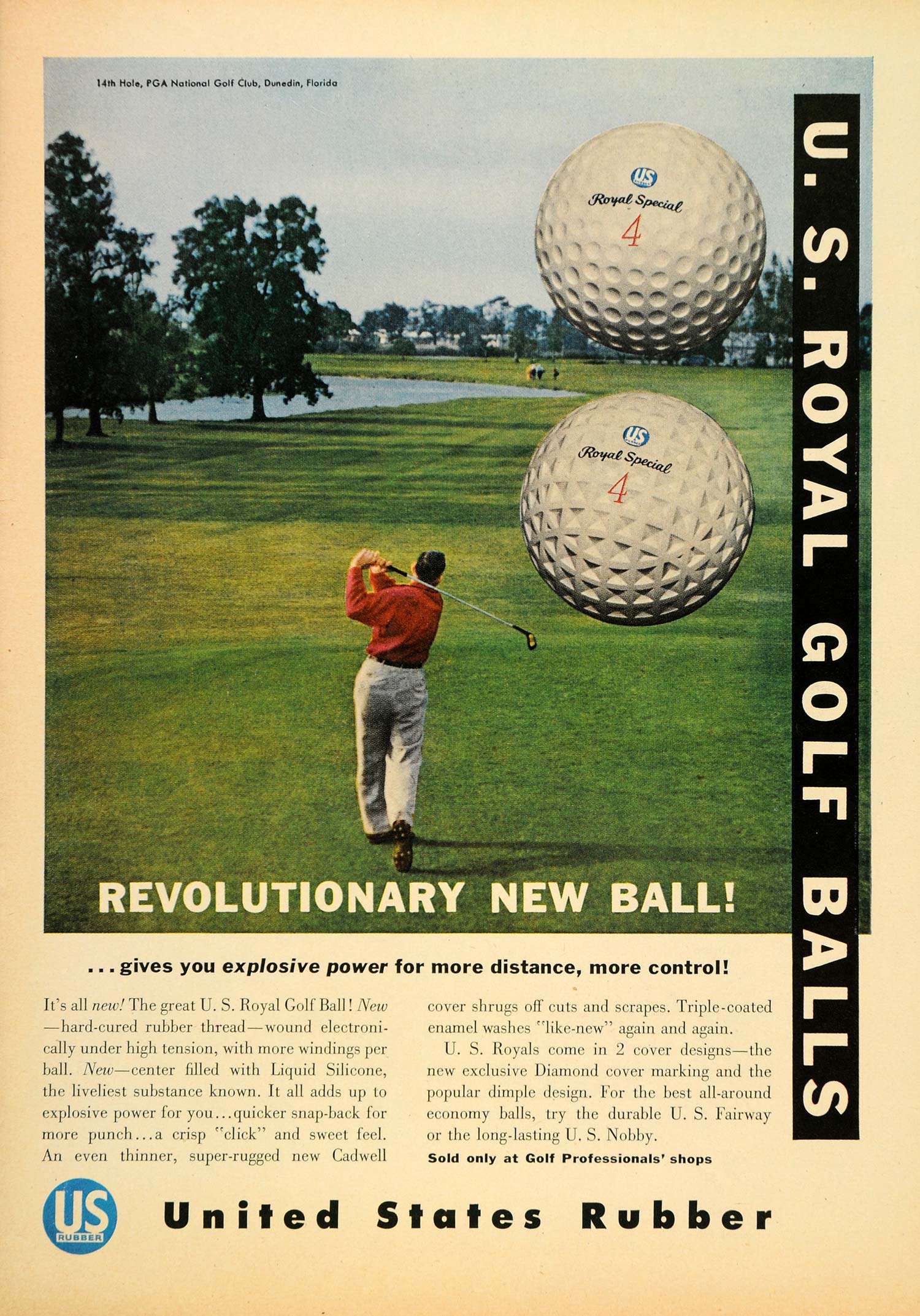 This is an original 1956 color print ad for U.S. Royal Golf Balls from the United States Rubber Company located in Naugatuck, Connecticut. A Revolutionary new ball. With two different designs, the classic dimple, and the new exclusive Diamond cover, you can really make these perfect for you.