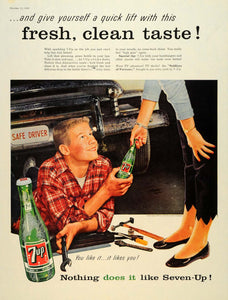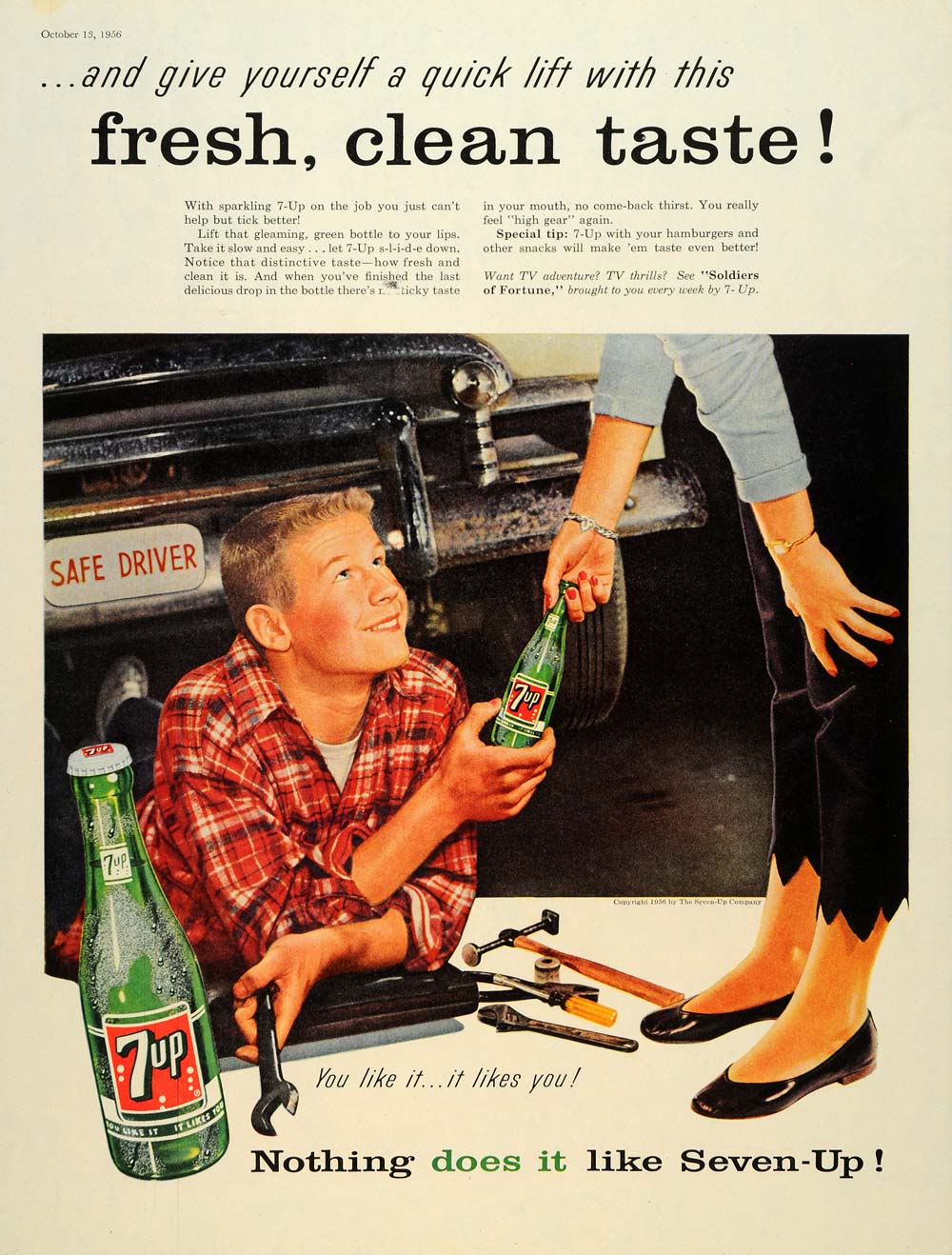 This is an original 1956 color print ad for Seven-Up (7-UP). This ad prides itself on a refreshing, clean-tasting pick-me-up that prevents thirst from returning. It also encourages consumers to drink 7-UP with hamburgers and other tasty snacks. This ad also features a TV special, "Soldiers of Fortune," that is sponsored by the Seven-Up Company.