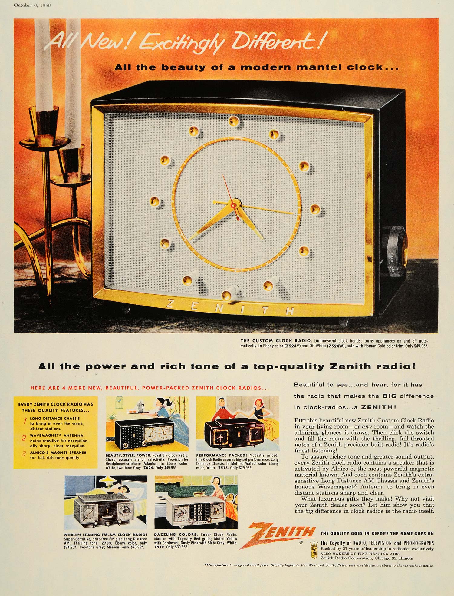 Keywords specific to this image: mantel clock radio, radio, Royal Six Clock Radio, FM-AM clock radio, Z624 radio, z515 radio, z733 radio, z519 radio, speaker, alnico-5, Wave magnet Antenna Vintage Advertising