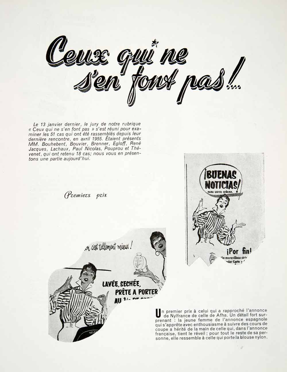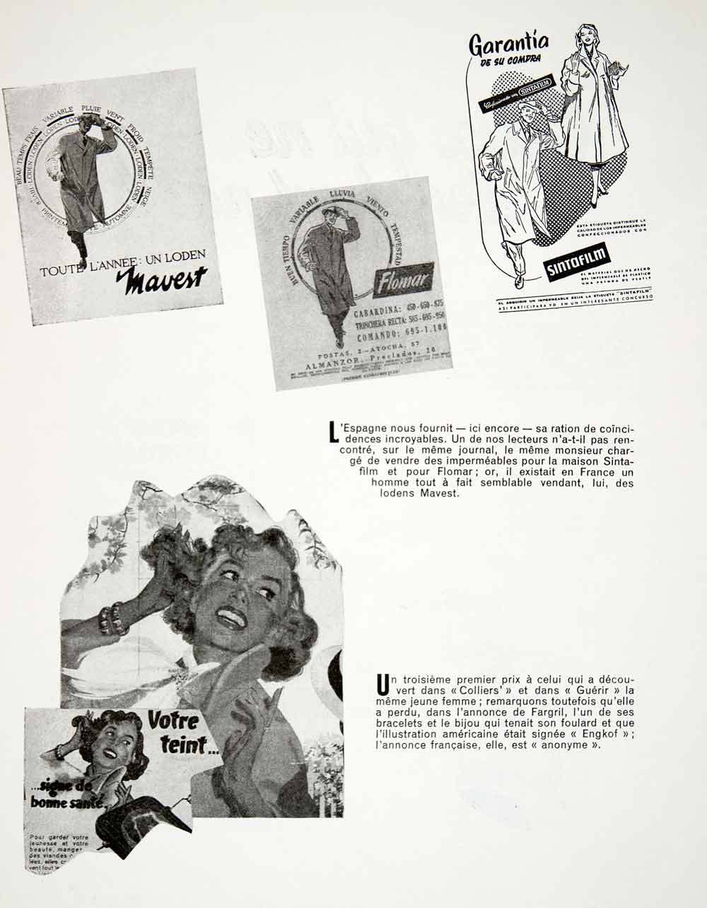This is an original 1956 5 page black and white print article (three pages, two being double-sided) entitled "Ceux qui ne s'en font pas!..." ("Those who aren't making anything for themselves!...") which explores some funny instances of advertising plagiarism that transcends both content and language barriers. Please be sure to view the additional images.
