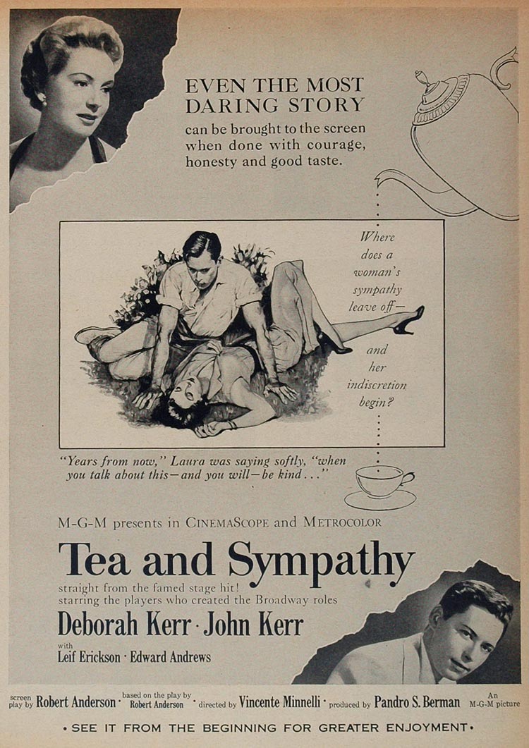This is a 1956 black and white print ad for the movie "Tea and Sympathy" starring Deborah Kerr and John Kerr with Leif Erickson and Edward Andrews. Produced by Pandro S. Berman and directed by Vincente Minnelli based on the play by Robert Anderson. An MGM Picture.