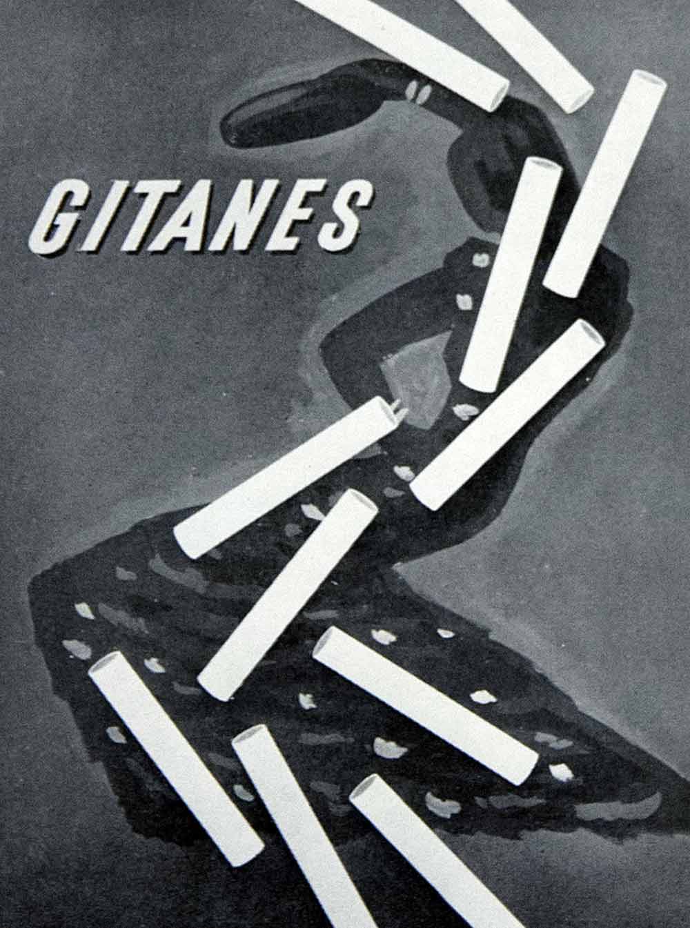 This is an original 1956 black and white halftone print of a French advertisement for Gitanes cigarettes.