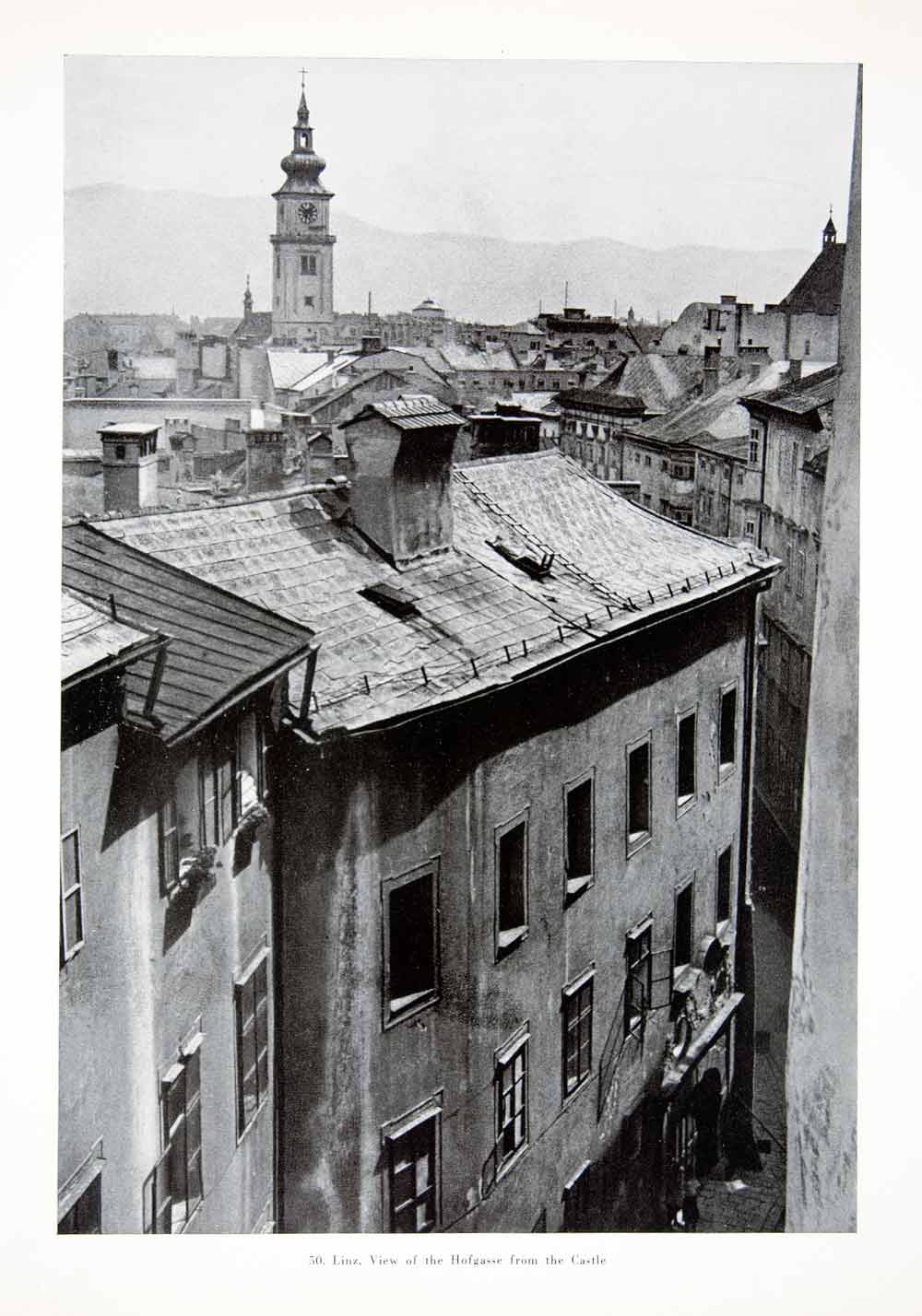 This is an original 1956 black and white halftone print of "Linz; a View of the Hofgasse from the Castle," in Austria.