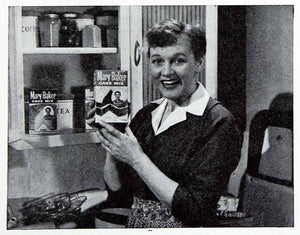 This is an original 1956 black and white halftone print of a commercial for Mary Baker Cake Mix, starring actress Rosamund John.