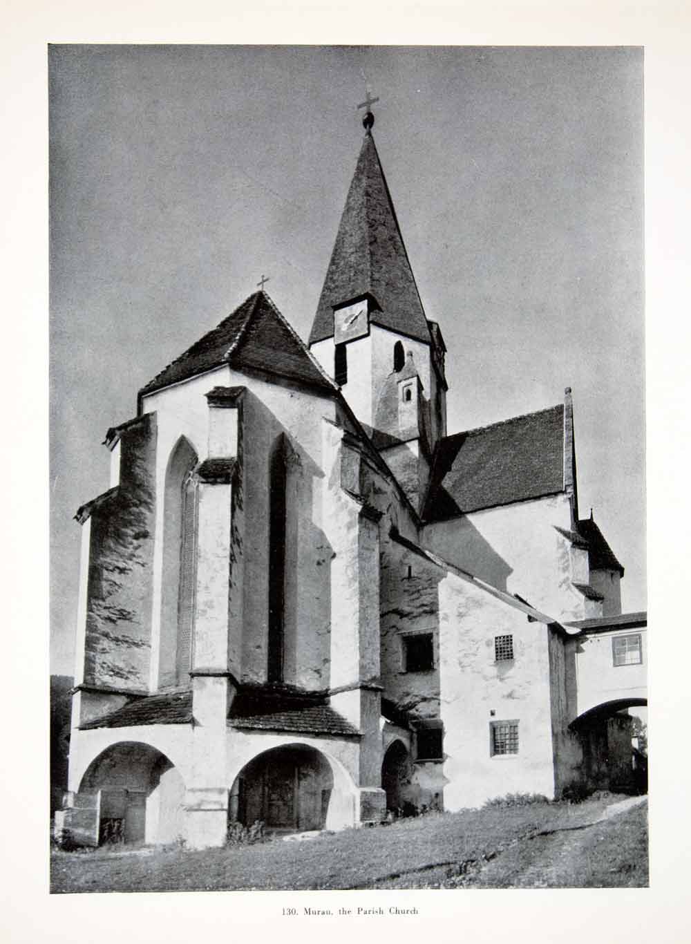 This is an original 1956 black and white halftone print of "Murau, the Parish Church," in Austria.