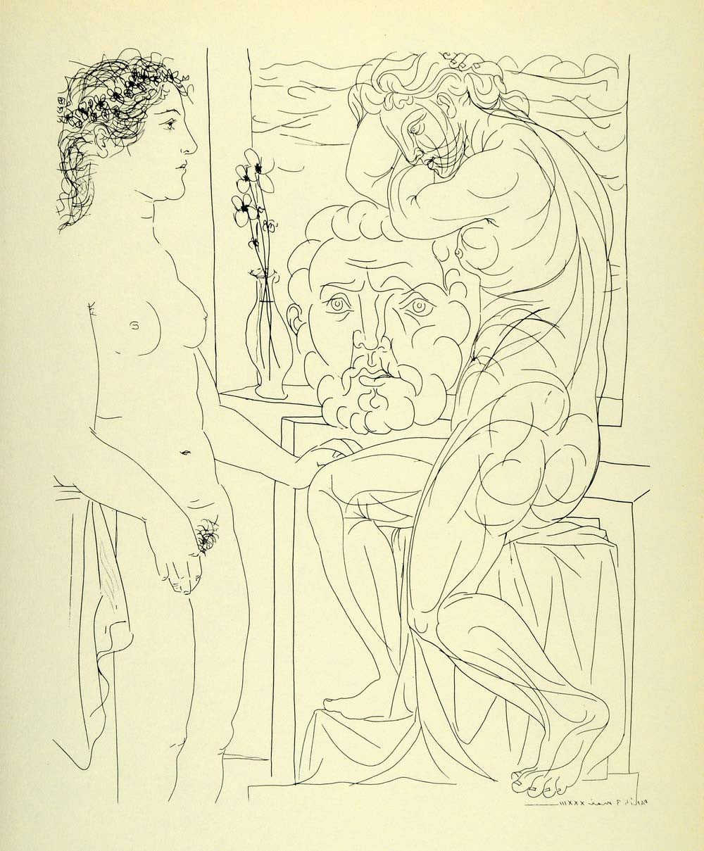 This is an original 1956 photolithograph print of an etching "Female Model and Two Sculptures" by Pablo Picasso, dated Paris, May 3, 1933.