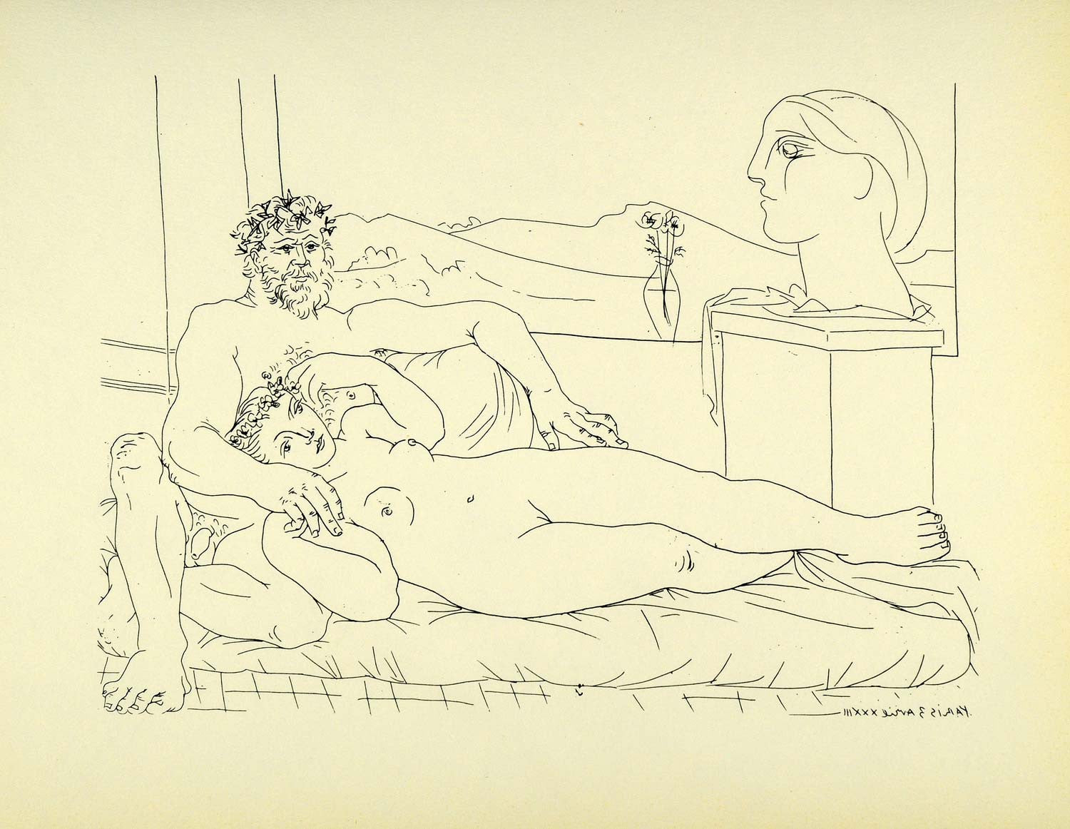 Period Paper is pleased to offer an original collection of original photolithograph prints of 100 line etchings (some with dry point) created by Pablo Picasso between 1930 and 1937. This compilation, known as the Suite Vollard, was created for Ambroise Vollard (1866(?)-1939), the great French art dealer and publisher of early 20th century modern art. Picasso's mistress, Marie-Therese Walter, was the model for many of these etchings. Each print offered is from the original, first edition portfolio produced in 1956, on heavy, structured stock. These prints have long been recognized as one of the supreme productions of the master's hand. Arising from Picasso's artistic caprice, from his working experience, or from the very depths of his unconscious, these plates show, more than any of his other works, a man at once inspired by and prey to his dazzling imagination and the demands of his inner demon.