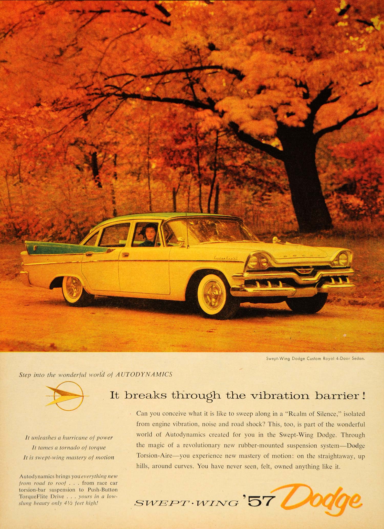 This is a beautiful original 1957 color print ad for Swept-Wing '57 Dodge automobiles, specifically featuring the Swept-Wing Dodge Custom Royal Four Door Sedan.