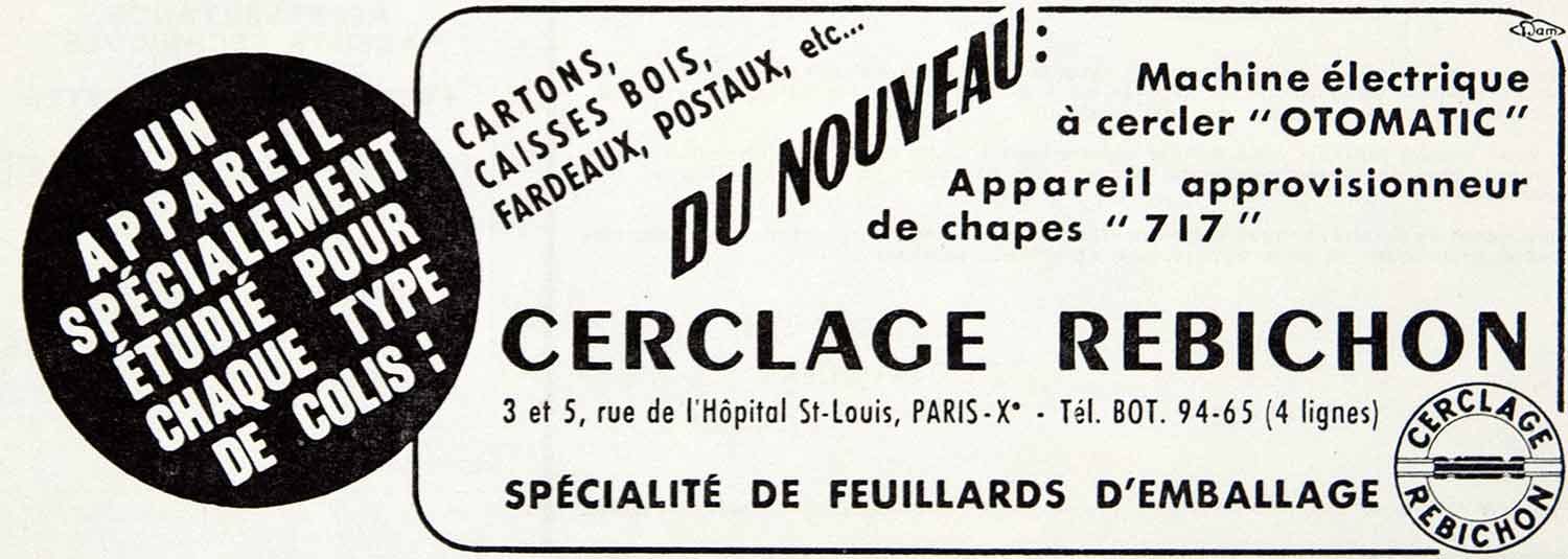 This is an original 1957 black and white print ad for the electric Otomatic machine, used to heat-seal plastic strapping, by Cerclage Rebichon, located at 3 and 5 rue de l'Hôpital St-Louis, Paris.