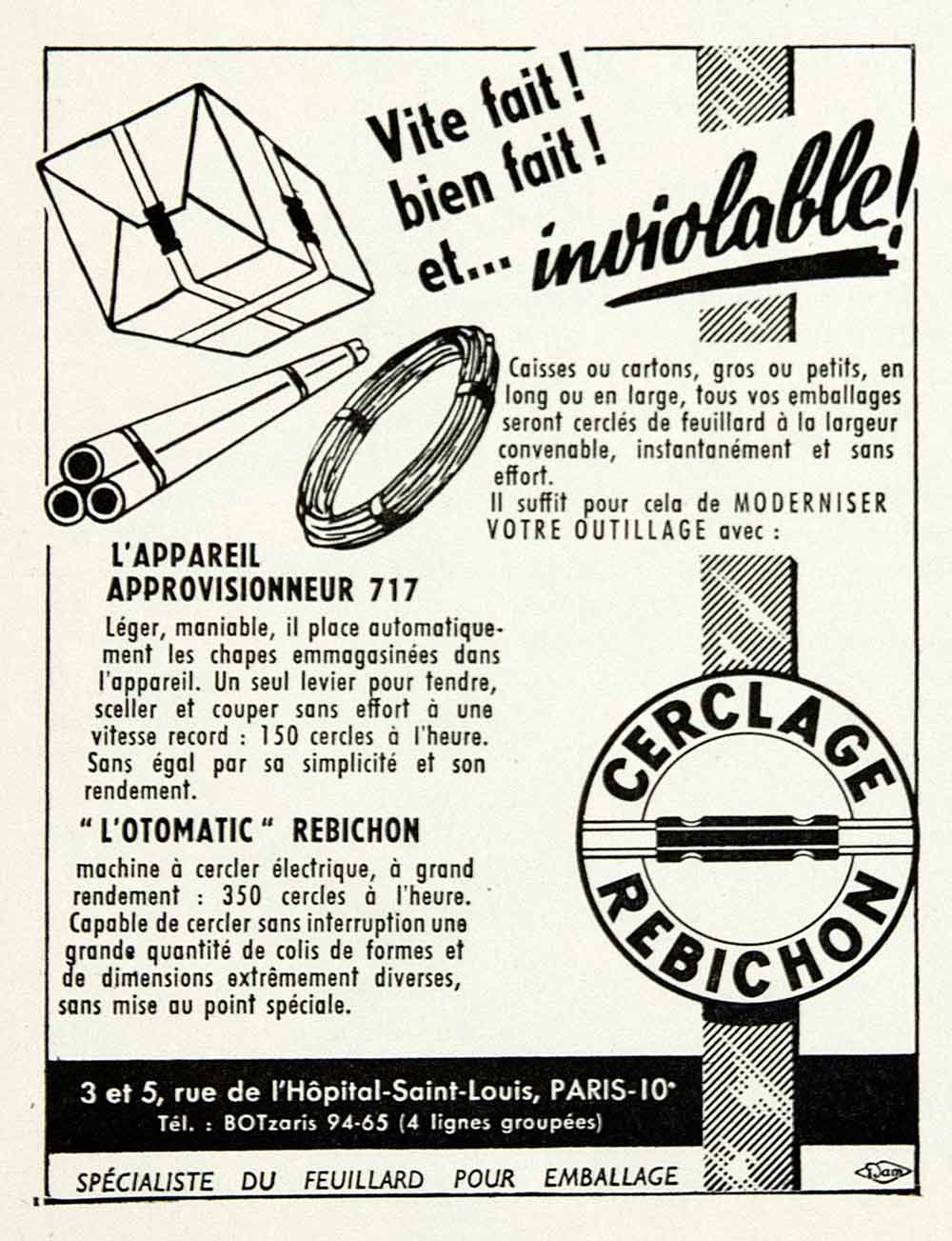 This is an original 1957 black and white print ad for Rebichon plastic ties and the Otomatic, a plastic tie machine that did the work for you. Their offices were located at 3 and 5 rue de l'Hôpital-Saint-Louis, Paris.