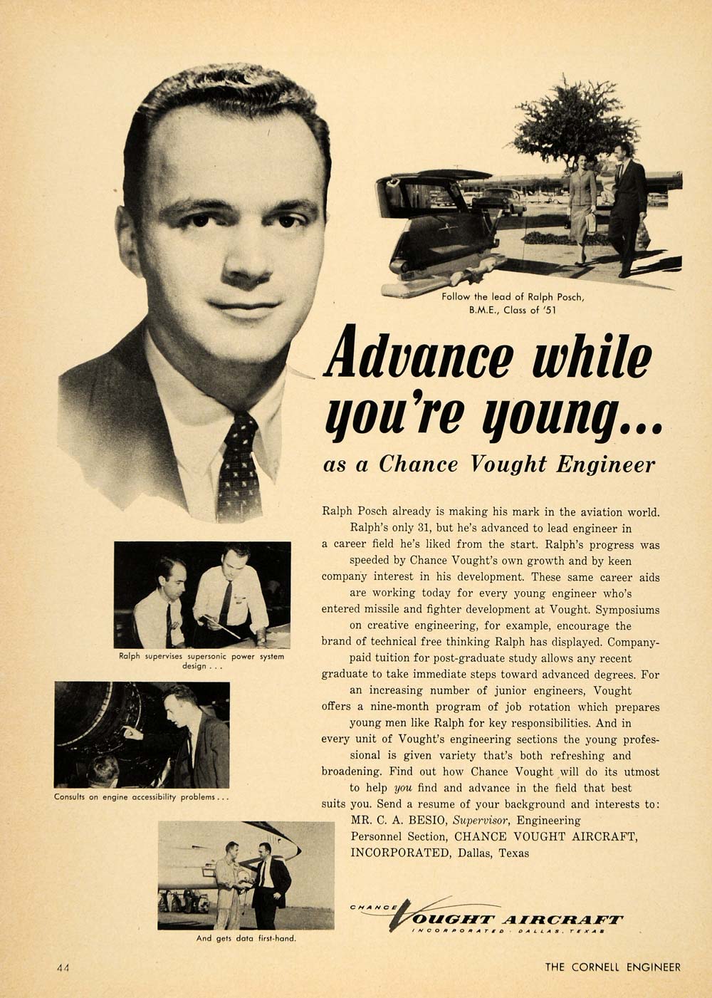 This is an original 1957 black and white print ad for Chance Vought Aircraft. The ad features an image of Ralph Posch, graduate of 1951.