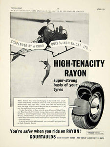 This is an original 1957 black and white print ad for Courtaulds "Tenasco" high-tenacity Rayon automobile tires that features a photo of Madame Andrée Jan hanging by her teeth from a helicopter flying over Derby airfield on June 17, 1956.