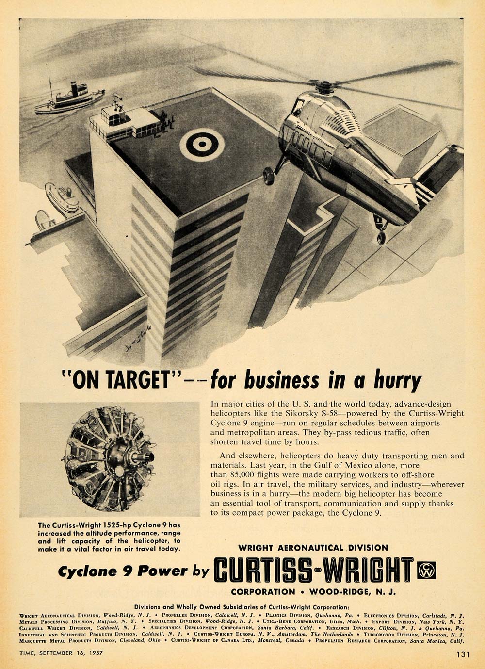 This is an original 1957 black and white print ad for the Curtiss-Wright 1525-hp Cyclone 9 power from Curtiss-Wright Corporation lcoated in Wood-Ridge, New Jersey.