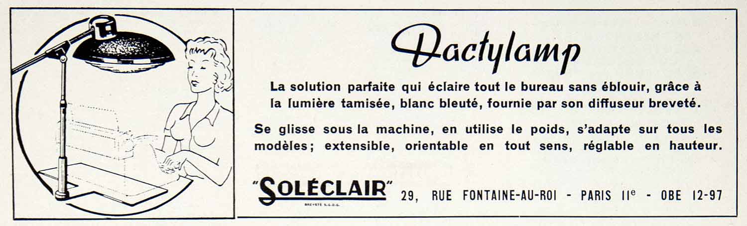This is an original 1957 black and white print ad for the adjustable Dactylamp, perfect for typewriter users, by Soléclair at 29 rue Fontain-au-Roi, Paris.