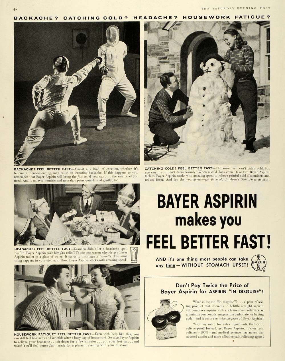 This is an original 1957 black and white print ad for Bayer Aspirin, the pill for colds, backaches, headaches, fatigue and more.