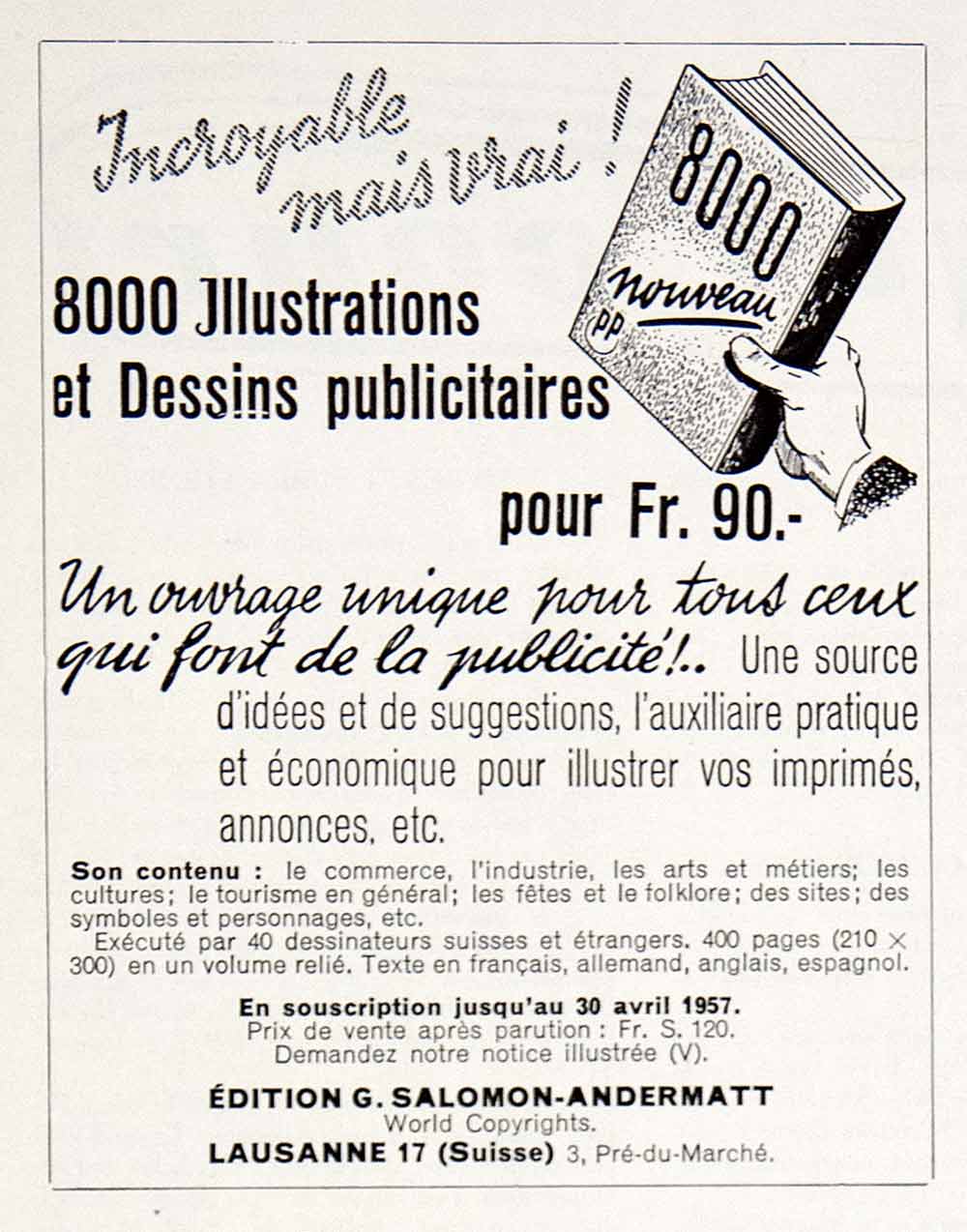 This is an original 1957 black and white print ad for the G. Salomon-Andermatt edition of a commercial graphic design publication intended to help businesses with their advertising. It featured 8000 different illustrations and drawings from both French and Swiss artists.