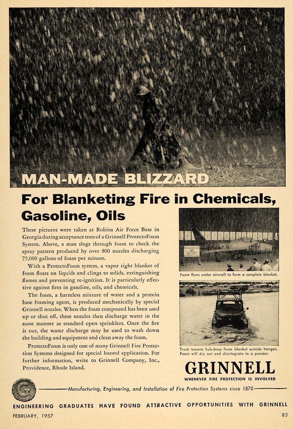 This is an original 1957 black and white print ad for Grinnell. The ad features images of Robins Air Force Base in Georgia trying out the ProtectoFoam system-- a blanket of foam that extinguishes fires and prevents re-ignition.