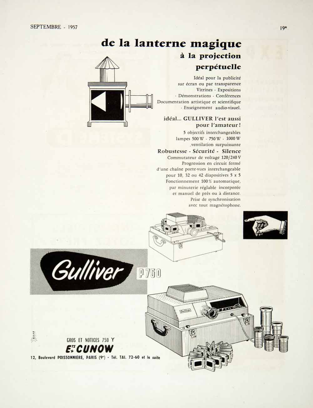 This is an original 1957 black and white print ad for Gulliver projectors by Cunow, whose offices were located at 12 Boulevard Poissonnière, Paris.
