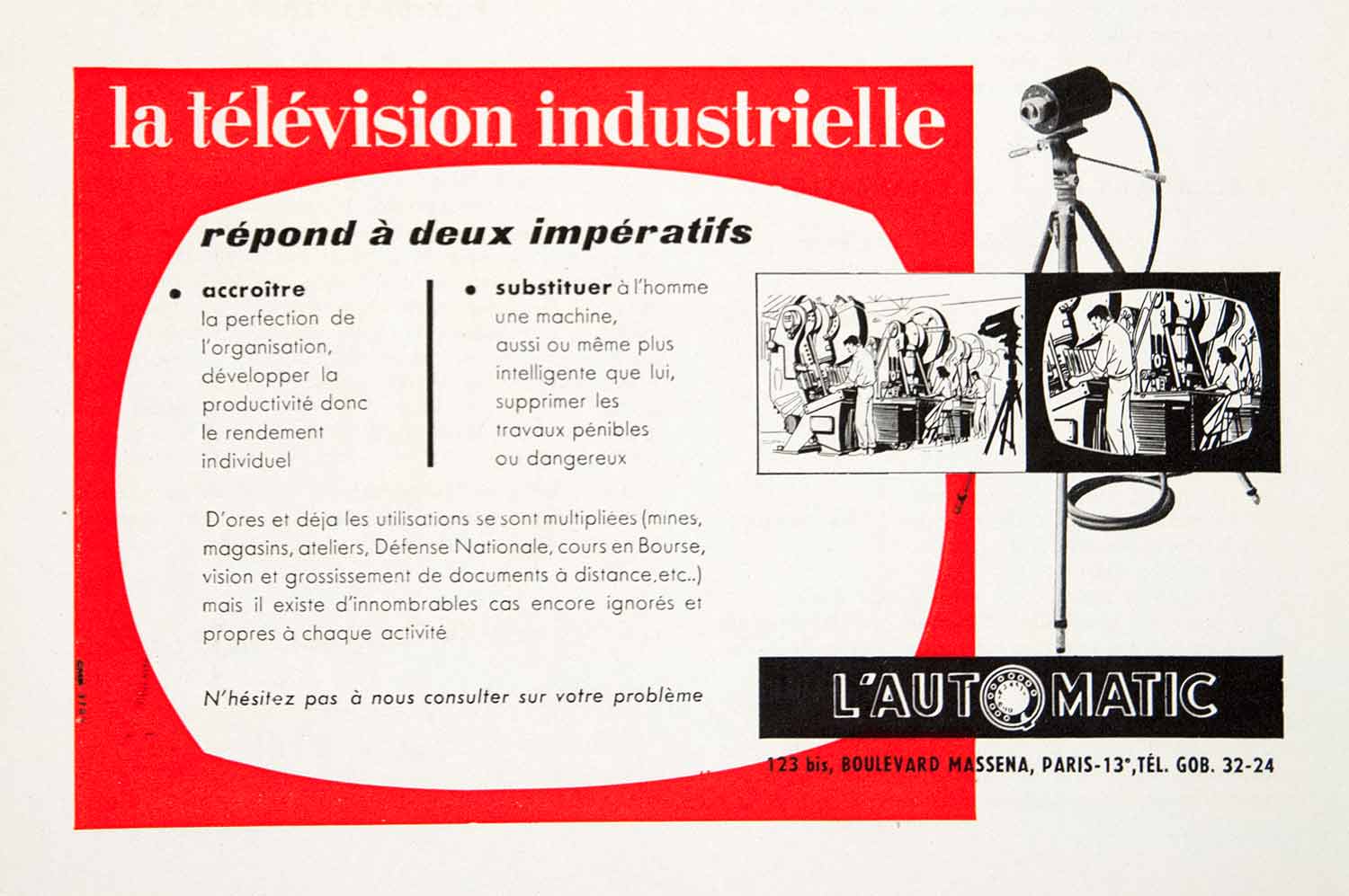 This is an original 1957 two-color print ad for L'Automatic televisions, to be used in an industrial setting, whose offices were located at 123 bis Boulevard Massena, Paris.