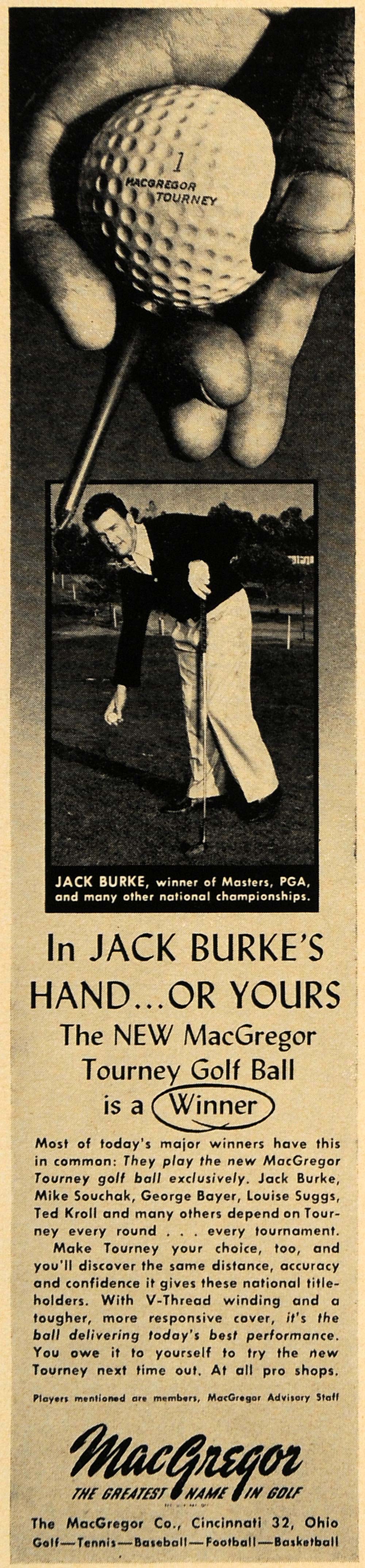 This is a small original 1957 black and white print ad for the MacGregor Company of Cincinnati, Ohio. The ad features an image of Jack Burke playing golf.