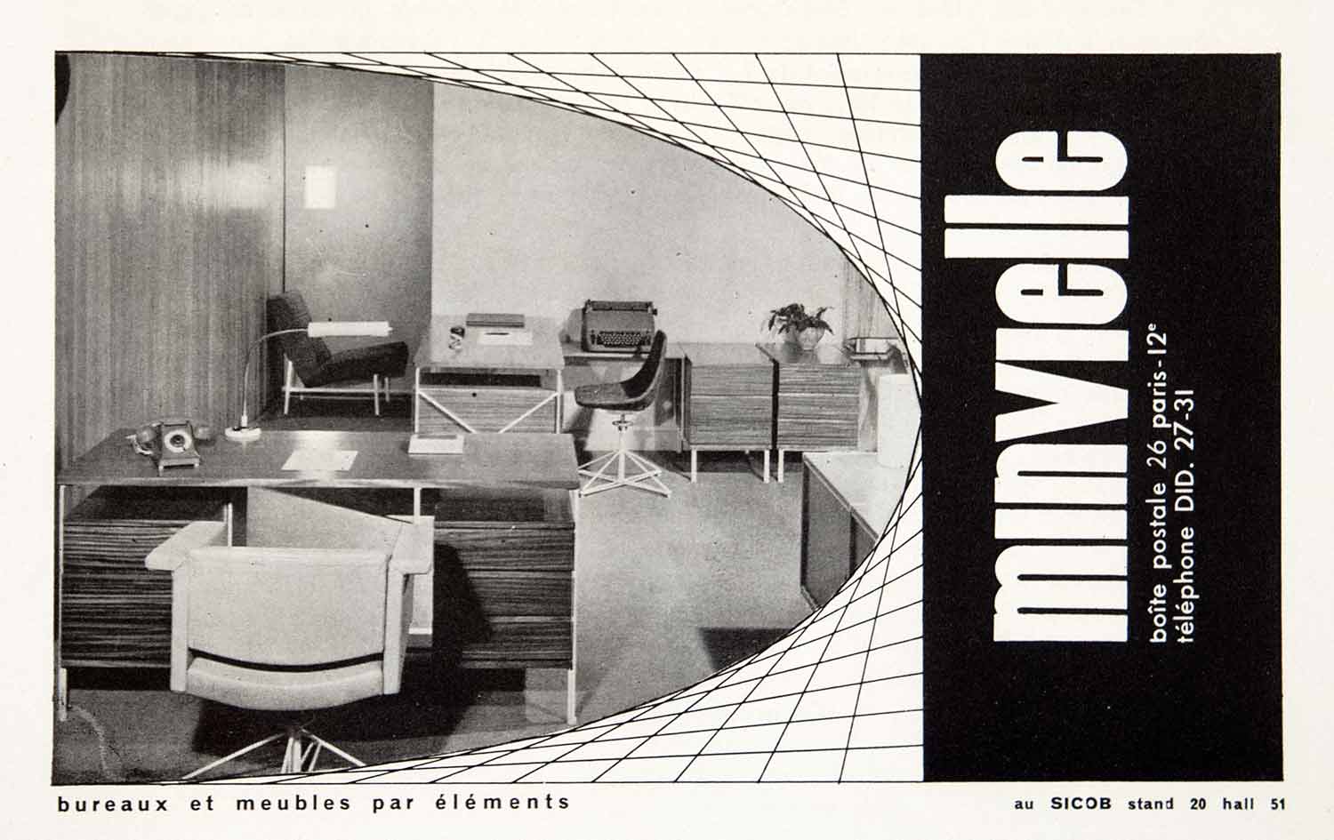 This is an original 1957 black and white print ad for Minvielle office furniture. It was possible to reach them at P.O. box 26, Paris.
