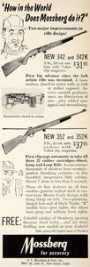 This is an original 1957 black and white print ad for the Model 342/342K and 351/352K .22 caliber carbine rifles that were made and sold by O.F. Mossberg & Sons, Inc. of 76511 St. John Street, New Haven, Connecticut (CT).