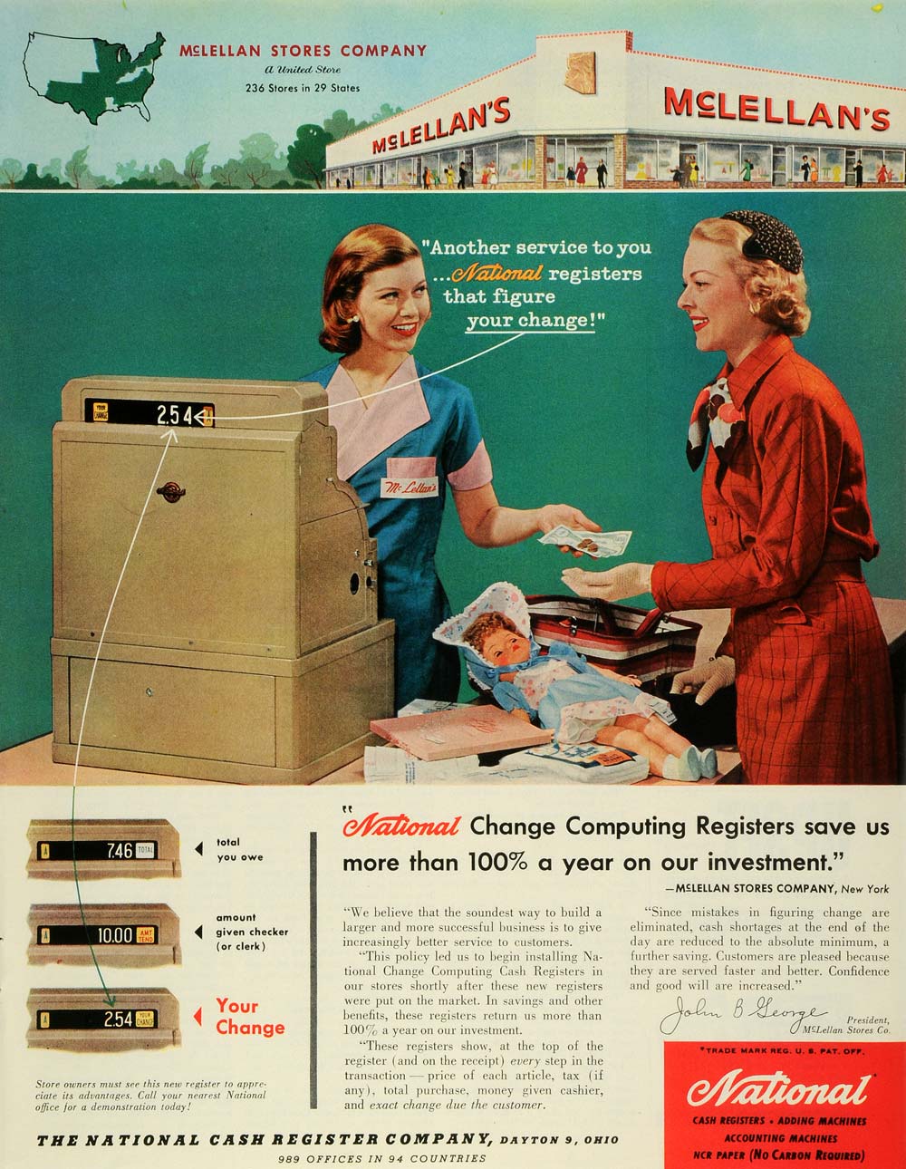 This is an original 1957 color print ad for the National Cash Registers, Change Computing Cash Registers, Adding Machines, Accounting Machines from the National Cash Register Company located in Dayton, Ohio. This ad features an image of the McLellan Stores Company building located in New York.