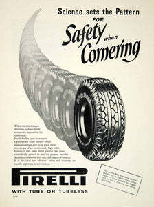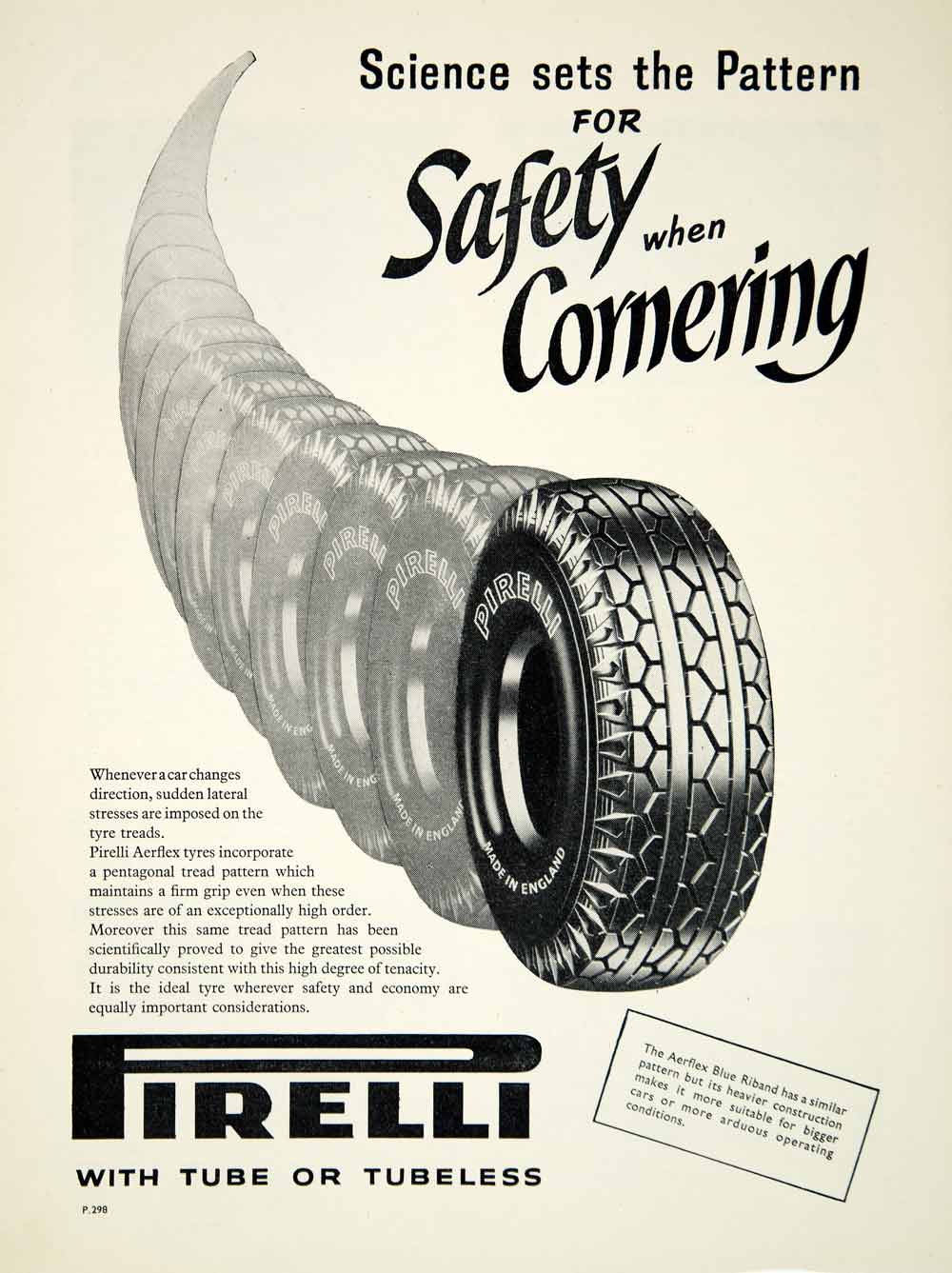 This is an original 1957 black and white print ad for Pirelli tube or tubeless Aerflex Blue Riband car tires.