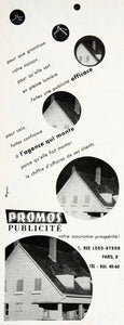 This is an original 1957 black and white print ad for Promos Publicité, a French advertising agency located at 1 rue Lord-Byron, Paris.
