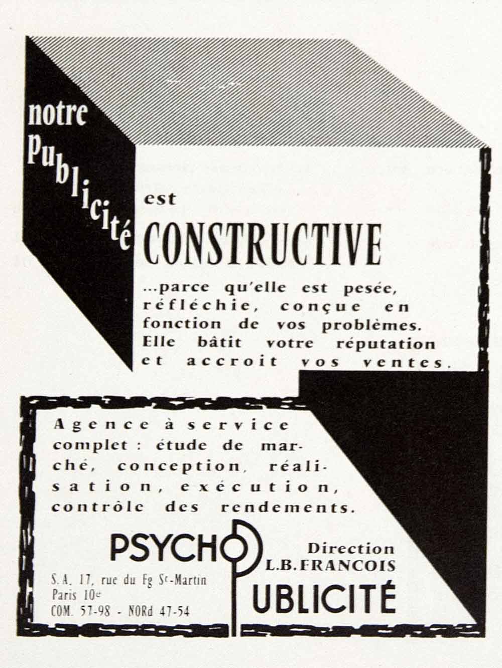 This is an original 1957 black and white print ad for Psycho Publicité advertising agency, located at 17 rue du faubourg Saint-Martin. They prided themselves not only on their unique name, but their ability to create novel advertisements based on a thorough analysis of the target market.