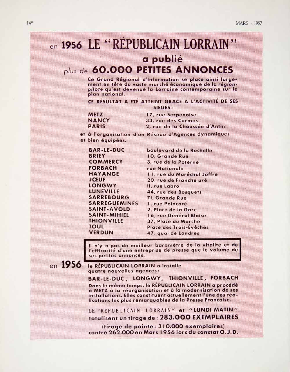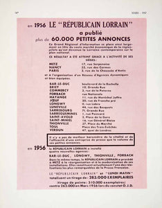 Le Républicain Lorrain, with a list of several major offices located in Metz (17 rue Serpenoise), Longwy (11 rue Labro), Toul (Place des Trois-Evêchés), and many more.