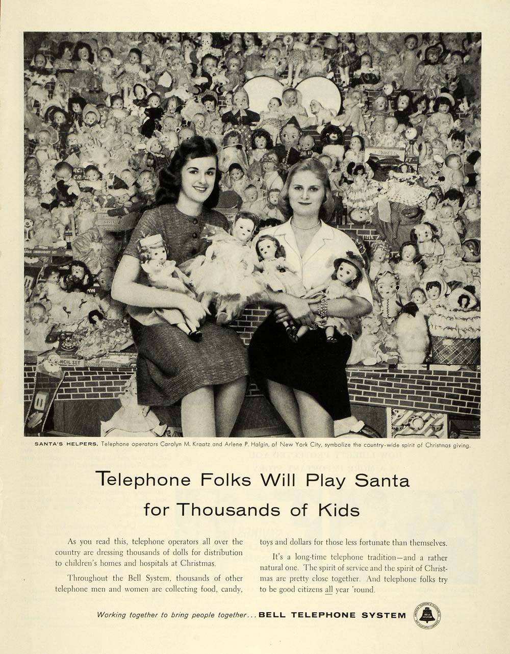 This is an original 1957 black and white print ad for Bell Telephone System by the American Telephone & Telegraph Company and associated companies. This ad has a picture of Carolyn M. Kraatz and Arlene P. Halgin who both work as telephone operators.