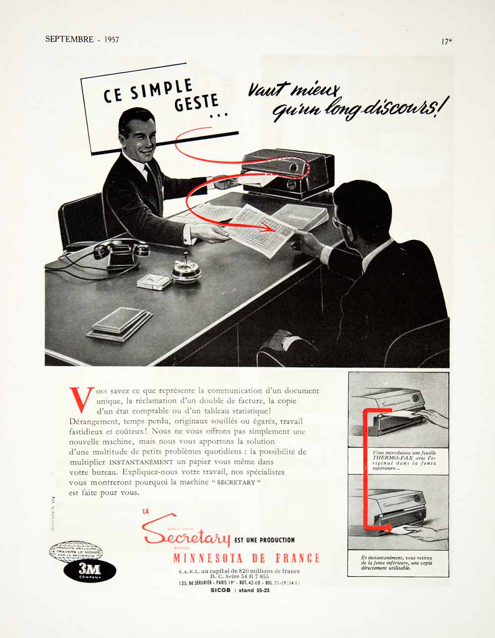 This is an original 1957 two-color print ad for the Secretary coping machine produced by Minnesota de France, located at 135 Boulevard Sérurier, Paris.