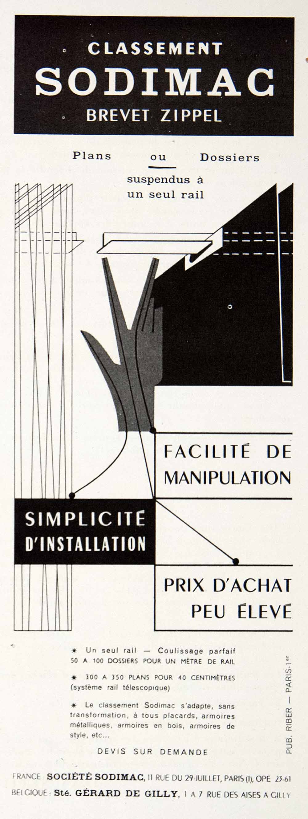 This is an original 1957 black and white print ad for Sodimac single-rail filing systems, under the Zippel patent. Their French offices were located at 11 rue du 29-Juillet, Paris, and they also had a Belgian location with the company Géerard de Gilly, at 1 to 7 rue des Aises à Gilly.