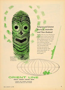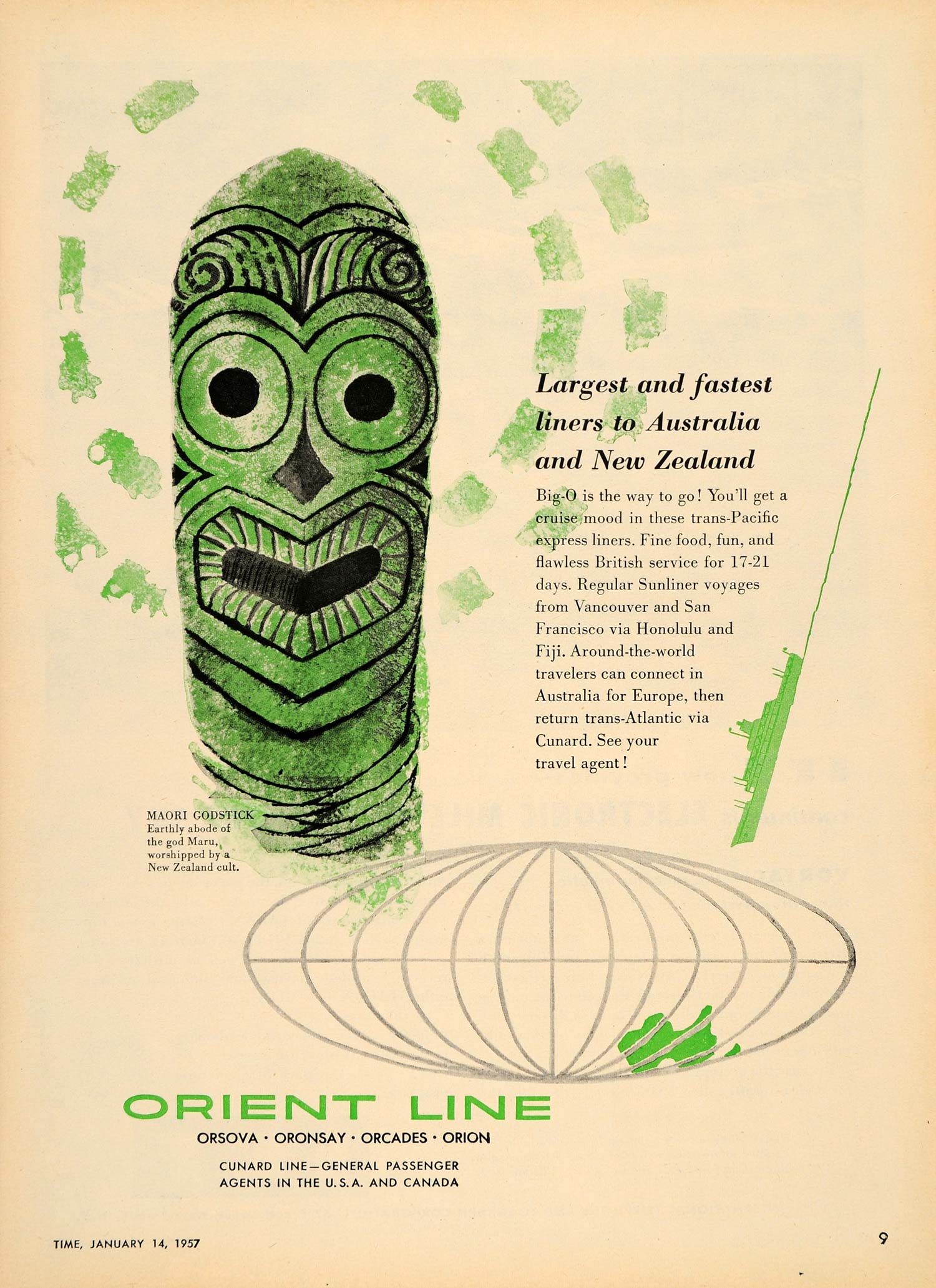 This is an original 1957 color print ad for the Orient Line, a cruise ship company that travels to Australia and New Zealand. Pictured in the ad is a Maori Godstick, worshipped by a New Zealand cult.