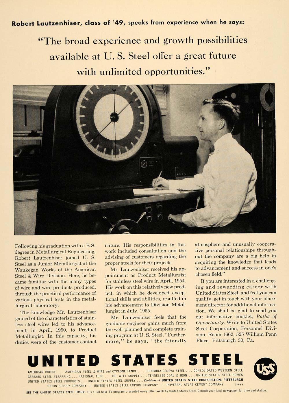 This is an original 1957 black and white print ad for United States Steel. The ad features an image of Robert Lautzenhiser from the class of 1949.