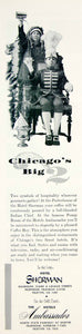This is an original 1957 black and white print ad for Chicago's big two hotels: the Hotel Sherman where your coffee will be poured by a full-blooded Indian Chief in the Porterhouse Room; and the Ambassador where you will be waited on by a plumed Coffee Boy in the Pump Room.