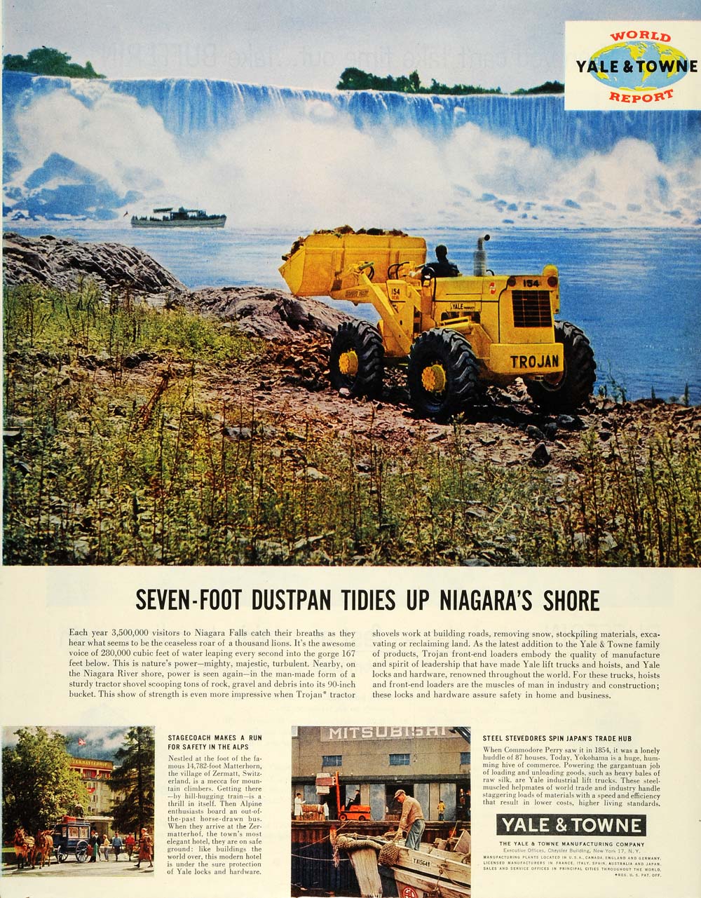 This is an original 1957 color print ad for the Trojan tractor, locks, hardware, industrial lift trucks and other machinery by The Yale & Towne Manufacturing Company. This ad features pictures of a Trojan tractor working near Niagara Falls, the Zermatterhof hotel in Zermatt, Switzerland and an industrial lift truck in Yokohama.