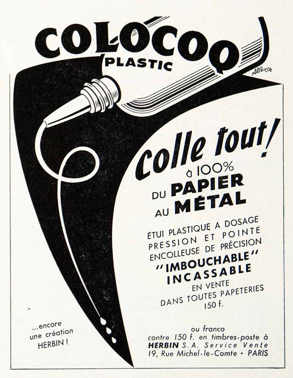 This is an original 1957 black and white print ad for Colocoq Plastic, a glue that would stick to anything from paper to metal. It was sold by Herbin S.A. Service Vente, located at 19 Rue Michel-le-Comte, Paris.