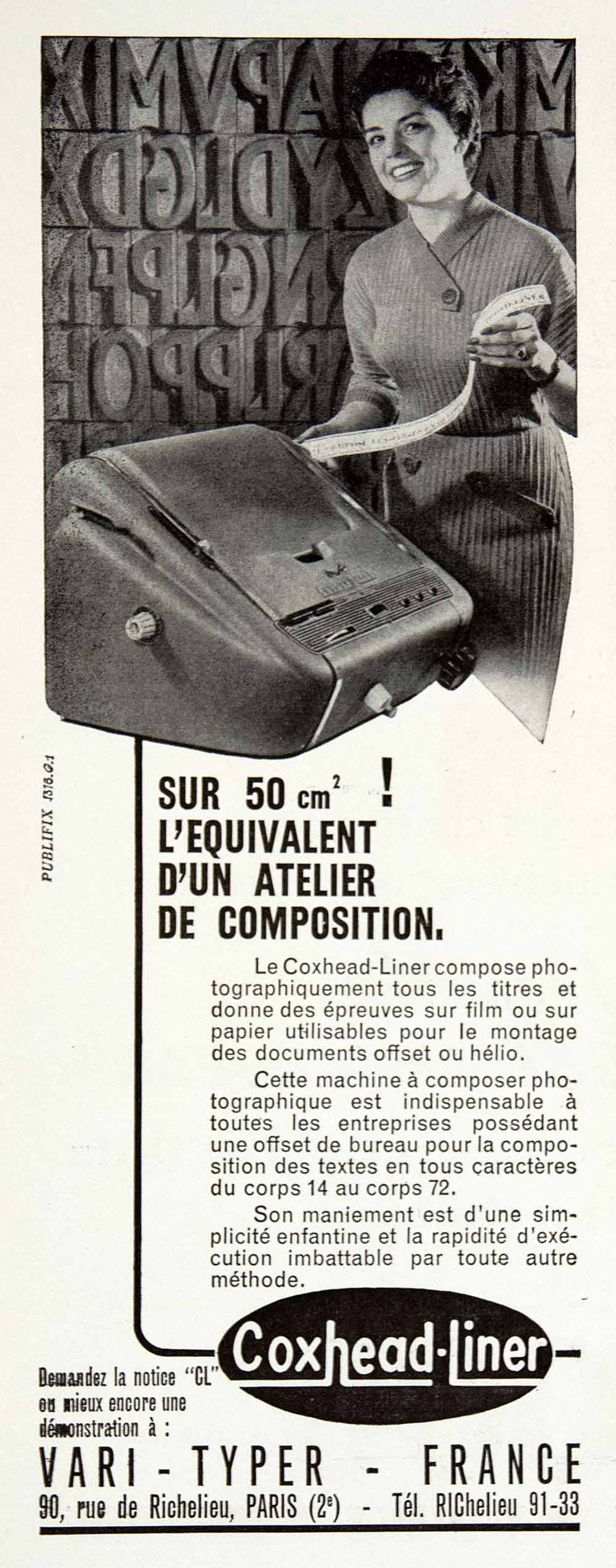 This is an original 1957 black and white print ad for the Coxhead-Liner photographic office machine by Vari-Typer-France. Their main office was located at 90 rue de Richelieu, Paris.