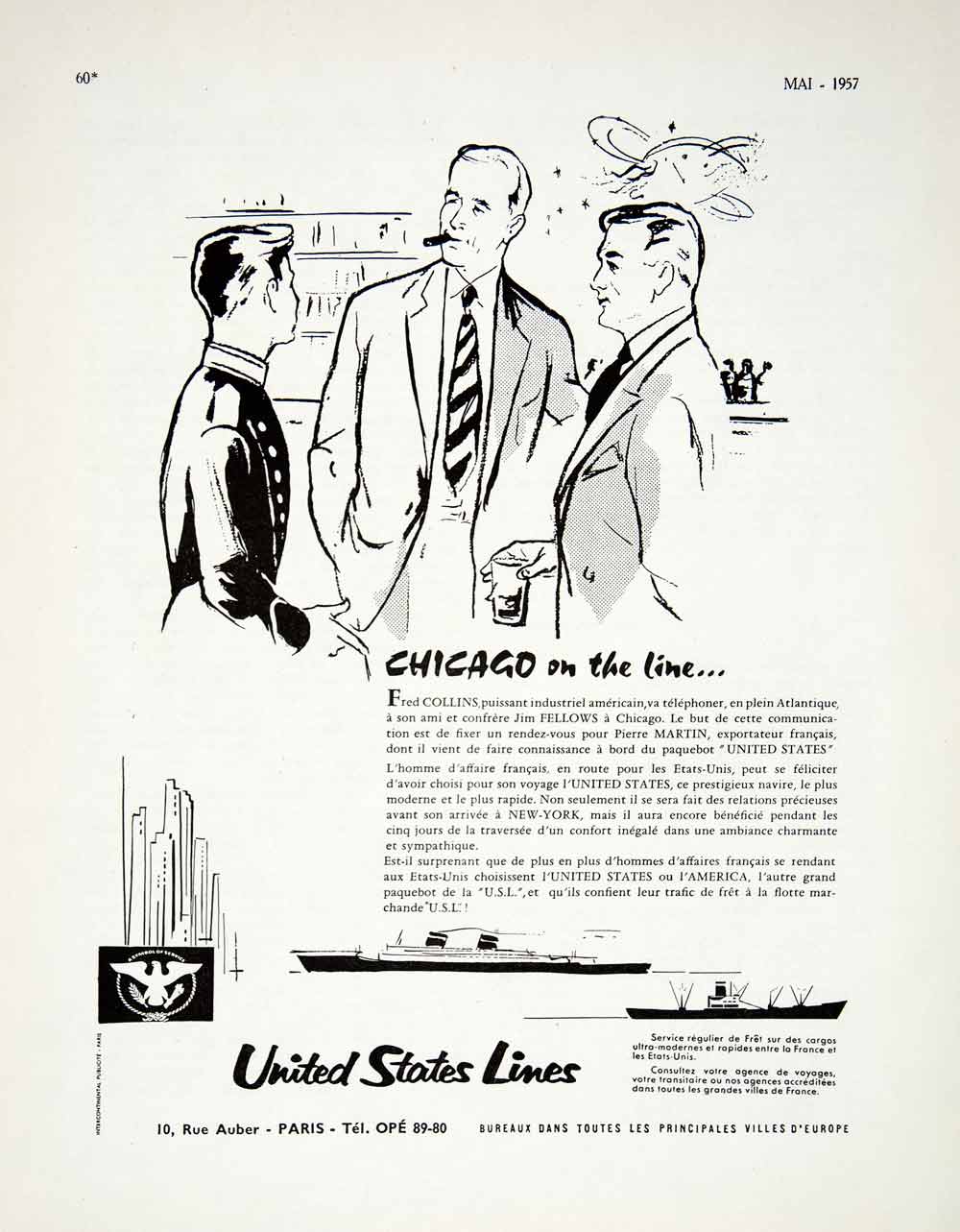 This is an original 1957 black and white print ad for the United States Lines (USL), popular steamboat transportation from Europe to America.