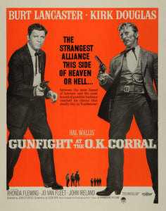 This is an original 1957 color print ad for Hal Wallis' production of "Gunfight at the O.K. Corral", starring Burt Lancaster and Kirk Douglas. Rhonda Fleming, Jo Van Fleet and John Ireland costar in this movie that is directed by John Sturges and the screenplay was done by Leon Uris. This Paramount Picture has music composed and conducted by Dimitri Tiomkin.