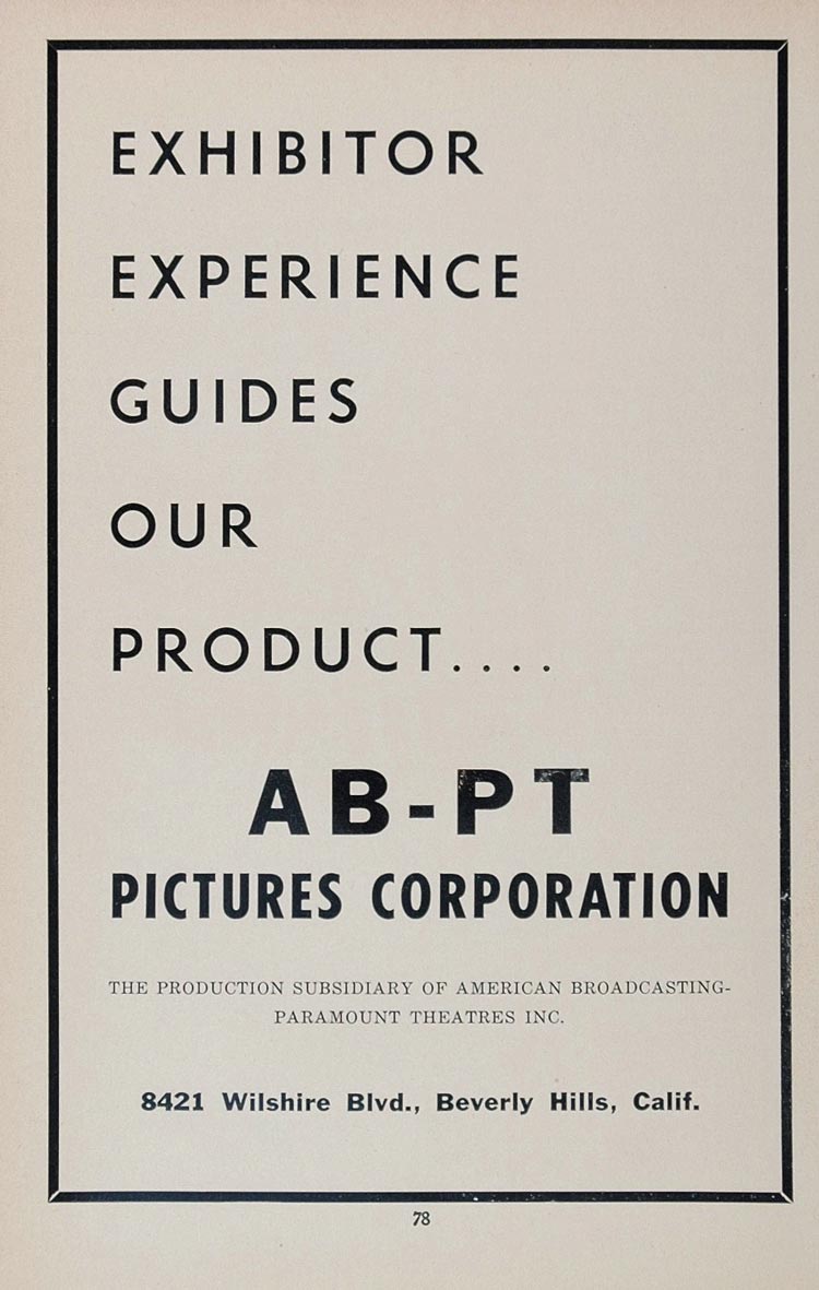 This is an original 1958 black and white print ad for AB-PT Pictures Corporation, the production subsidiary of American Broadcasting-Paramount Theatres Inc., 8421 Wilshire Blvd., Beverly Hills, CA.